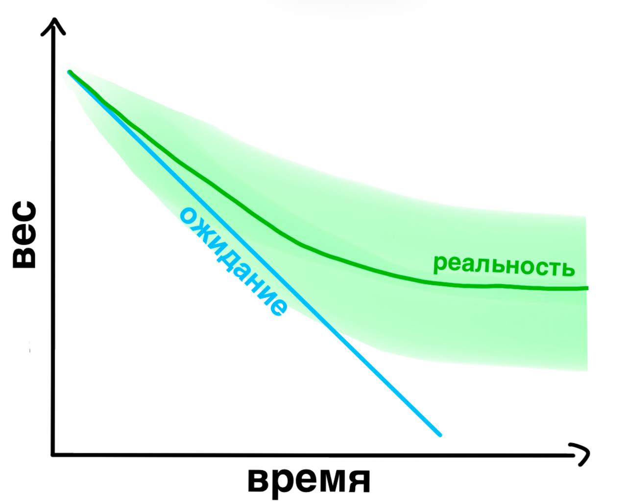 Согласно устаревшим рекомендациям, дефицит энергии в 500–1000 ккал в день в сочетании с умеренной физической активностью должен приводить к снижению веса на 0,5–1 кг в неделю. Это так называемое «правило 3500 ккал», основанное на расчетной энергетической ценности жировой ткани. Однако Европейская ассоциация по изучению ожирения (EASO) вместе с другими крупными организациями здравоохранения признало, что это простое правило является неточным. На практике линейная динамика снижения веса наблюдается редко. Пациенты неизбежно сталкиваются с фазой плато — состоянием, при котором вес стабилизируется, несмотря на сохраняющийся дефицит калорий и физические нагрузки. Понимание этого феномена требует рассмотрения сложных биологических адаптаций организма